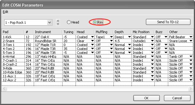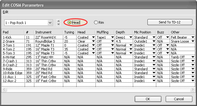 There are 2 instruments assigned two each trigger input on the TD-20/12 -- Head and Rim. The editor window has two radio buttons that allow you to choose between viewing all of the head instruments OR all of the rim instruments. You can make your choice by simply clicking on either radio button. |