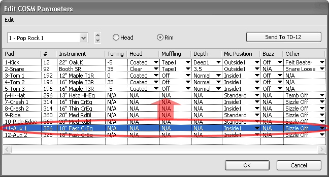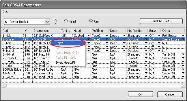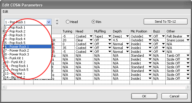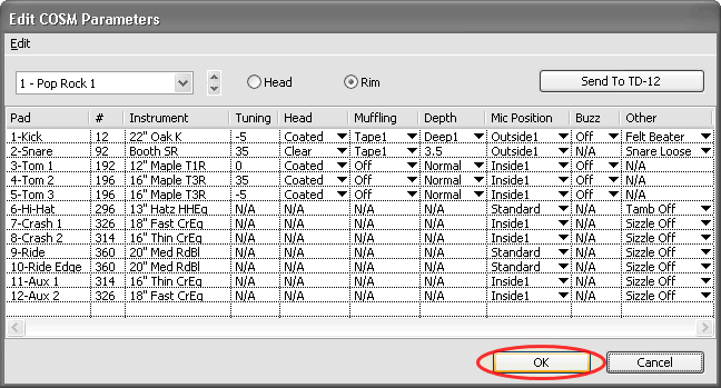 The VDrumLib COSM editor uses a spreadsheet form to allow you to see and edit ALL of the instruments for all of your pads at the same time. One thing that is of special interest to TD-12 owners is that many of these parameters are not accessible from the TD-12's built-in editor. These special TD-20 COSM parameters can be heard on your TD-12, but the only way you can see or change these "hidden" COSM parameters is with the VDrumLib COSM editor. Here is a list of the COSM parameters that TD-12 owners can access only via VDrumLib: Five Mic Positions, Eight Levels Of Snare Buzz, Three Kick Beater Types, Hi-Hat Tambourine, and Cymbal Rivets and Chains. |