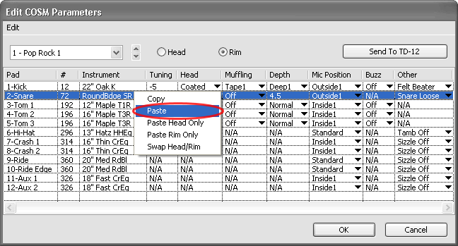 NOTE: When you copy and paste an instrument in VDrumLib, VDrumlib copies ALL of the parameters that define the sound of the instrument -- this includes everything except the MIDI Information which stays with the pad. Here are a list of parameters that are copied for each instrument: Instrument#, COSM, Pattern#, Pattern Velocity, Mixer Volume, Panning, Ambience Send Level, EFX Send Level, Minimum Volume, Compression, EQ, Pedal Pitch.