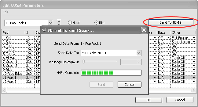 As you make changes to a kit, you might want to hear what it will sound like on your drum module. To send a single kit to your drum module, you can press the Send To ... button located at the upper right corner of the editor window. The "Send Data From:" label shows the kit number and name of the kit that will be sent to your module. |