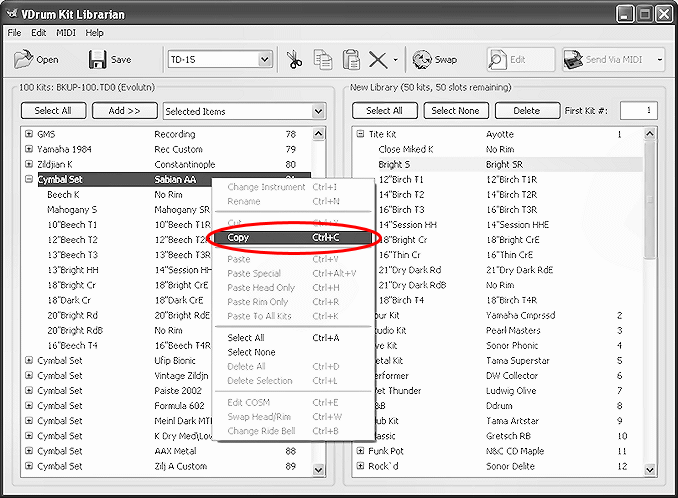 The fist screen shot shows a special drum kit called a "Cymbal Set " that is filled with Sabian AA cymbals. In this example, we will copy all of the cymbals and the kick drum head and paste it to another kit. The first step is to copy the entire kit called "Cymbal Set Sabian AA." The screen below shows the use of the "right-click" menu to select the "Copy" command. You can also just click to select the kit and use the Ctrl-C keyboard shortcut.