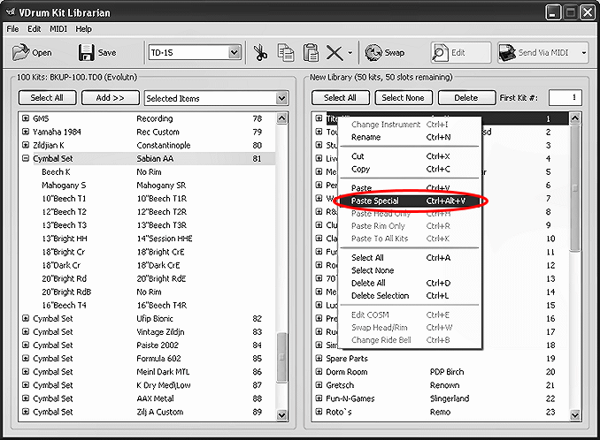 Let's say you want to copy ALL of the cymbals from one kit and paste them into multiple kits at the same time. Or maybe you want to copy just the AUX1 Rim instrument from one kit and paste it to the AUX2 head pads in all of the other drum kits. VDrumLib has a very powerful function called "Paste Special" to accomplish these kinds of tasks very rapidly. Follow the screen flow below to see how quick and easy it is to accomplish this otherwise time consuming task.
