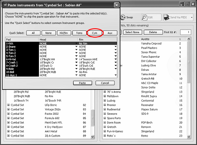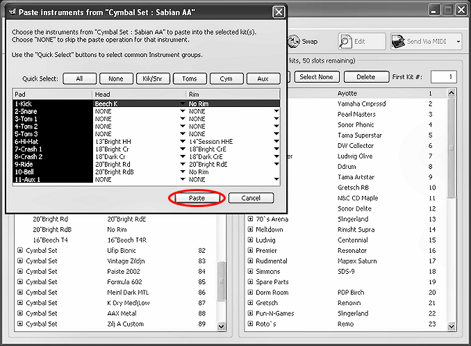 Next, the paste special dialog box will be displayed to allow you to choose which instruments to copy to which pads of the destination kit(s). You don't have to paste all of the instruments, and you don't have to paste them to the same pads as the original source kit.