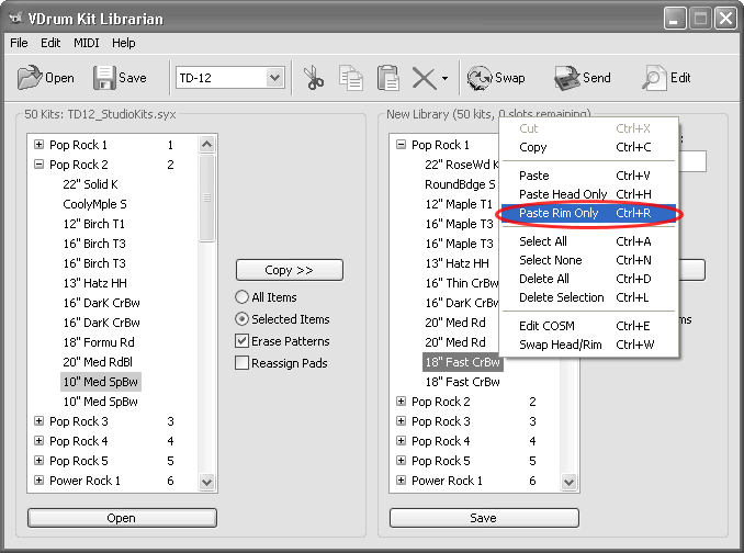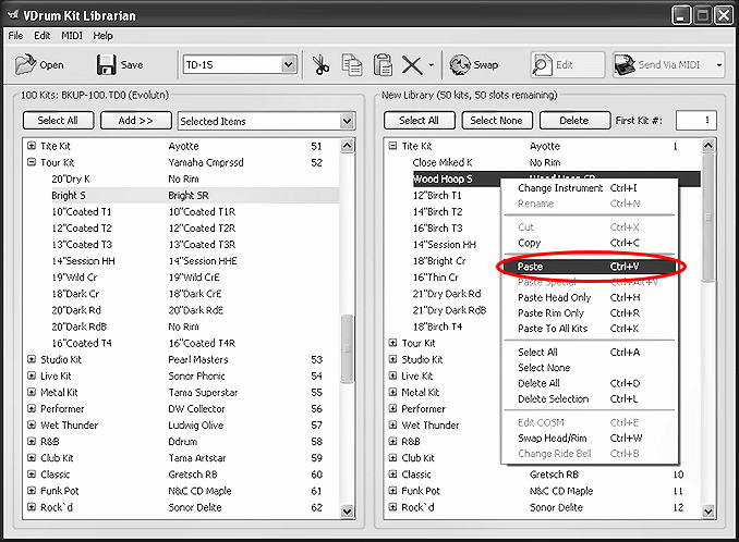 VDrumLib offers several types of paste operations that can be used to paste instrument data: (1) Paste both Head and Rim instruments (ctrl+V), (2) Paste only the Head (ctrl+H), (3) Paste only the Rim (ctrl+R). |