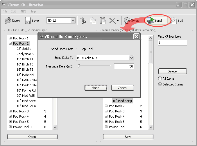 As you build your kits, you might want to hear what it will sound like on your drum module. To send a single kit to your drum module, you can use the "Send Single Kit" option from the MIDI Menu. There are 3 ways to invoke this option (1) directly from the MIDI menu, (2) Keyboard shortcut (ctrl+M), or by (3) clicking the "Send" icon on the toolbar. The screen image below demonstrates the toolbar icon method. |