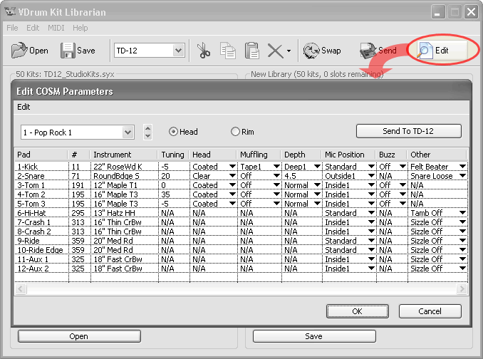 Finally, VDrumLib has a built-in editor that allows you to view and change instrument parameters. You can access the editor by (1) clicking on the Edit icon on the toolbar, as shown below, or (2) Directly from the Edit menu, or (3) Via the "right click" pop-up edit menu, or (4) via keyboard shortcut (ctrl+E). For more instructions on using the editor, click here. |