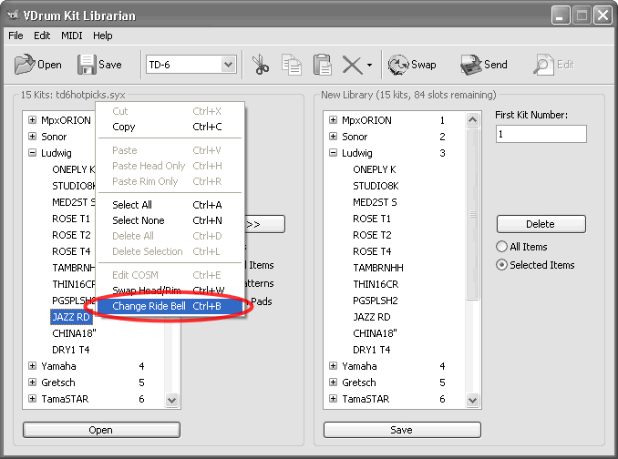 Instruments in each drum kit can be easily changed using the "Copy and Paste" functions available from the VDrumLib Edit menu. There are actually multiple methods to access the Edit Menu functions: (1) Directly from the menu, (2) Via the Toolbar icons, (3) Right click on the selected instrument to pop-up the Edit menu, or (4) Keyboard shortcuts i.e., ctrl+C = copy, ctrl+W = swap head and rim instruments, etc. The screen image below shows the "right click" pop-menu method. Instruments can be copied from either the source list on the left, OR the destination list on the right. However, you can only paste instruments into kits in the destination list on the right. |