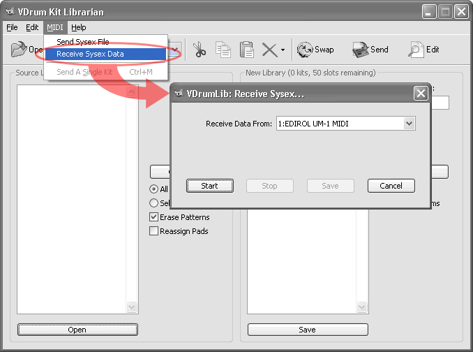 To have VDrumLib receive a SYSEX backup from your Roland Module, select the Receive Sysex Data option from the MIDI drop down menu. As a result, VDrumLib will display the "Receive Sysex" dialog box. |