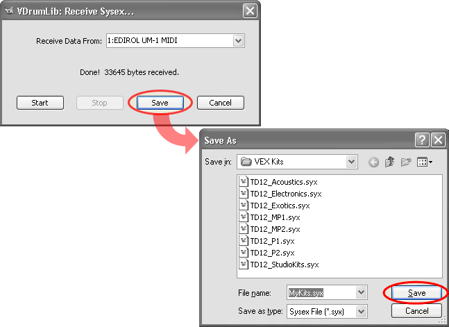 To save the MIDI bulk dump, simply press the Save button. You will be prompted with a standard Windows "Save As" dialog box to choose a name and location to save your MIDI *.syx bulk dump. Note, the .syx file extension will automatically be added to the file name if you don't type one in. |