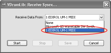 Before you can start the data acquisition process, VDrumLib needs to know which MIDI input device you have hooked up to your Roland drum module. You can select your MIDI input device from the drop down list at the top of the dialog box. |
