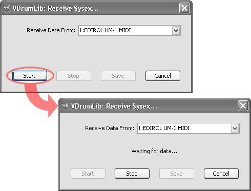 Now that VDrumLib knows which MIDI input is hooked up to your Roland drum module, you can start the data acquisition process by simply pressing the Start button, which is located at the bottom right corner of the dialog box. To indicate that it is now ready to start receiving sysex data from your Roland drum module, VDrumLib will display a "Waiting for data..." message directly below the MIDI input device selection list. |