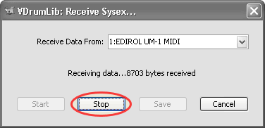 While VDrumLib is receiving MIDI data, the reception status message will say "Receiving data...", and the count of bytes received will continue to increment. When your drum module has no more data to send, it will display a "Completed!" message. At this point, the byte count on the VDrumLib status message will stop incrementing, and it is time to press the Stop button. |