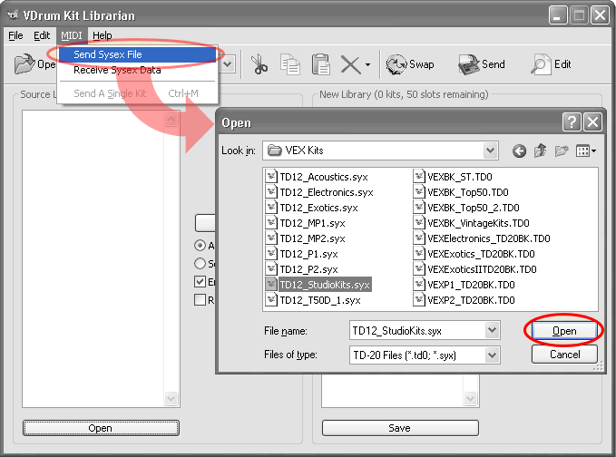 To send a SYSEX backup from VDrumLib to your Roland drum module, select the Send Sysex Data option from the MIDI drop down menu. You will be prompted with a standard Windows "Open" dialog box to choose the MIDI *.syx bulk dump to transmit to your drum module. |