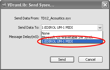 Now that VDrumLib knows which MIDI output device is hooked up to your Roland drum module, you can start sending the data to your drum module by pressing the Send button, which is located at the bottom right corner of the dialog box. |