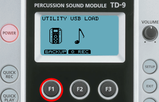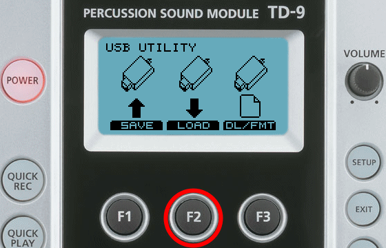 To transfer your new backup to your TD-9, start by choosing the LOAD option from the USB UTILITY menu, by pressing the F2(LOAD) button. |