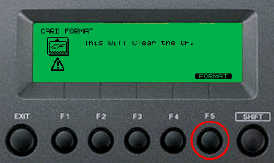 Formatting a card will erase the entire contents of the card. So, if you have any data on the card that you want to backup, be sure to backup your data before proceeding. If you are okay with erasing the entire card, press F5 to confirm. |