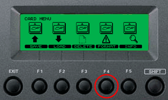 Before you can use a Compact Flash Card with your TD-20, the card must be formatted on your TD-20. Even if the card has been previously formatted on a computer, it is still recommended that you format it on your TD-20, first. To begin the formatting process, press the F4 button to choose the FORMAT option from the CARD MENU. |