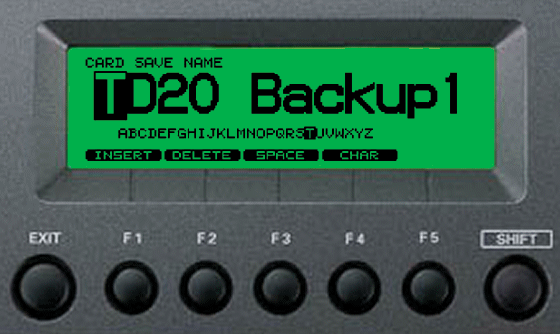 Your TD-20 can save up to 8 backup files to a compact flash card. Each backup contains ALL user data from your TD-20. User data includes the trigger settings in all trigger banks, all 50 user drum kits, all percussion groups, all kit chains, all user patterns (101-200), and all global module settings. To start the backup process, press the F1 button to choose the SAVE option from the main CARD MENU. |