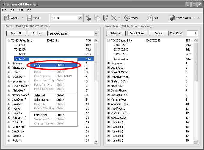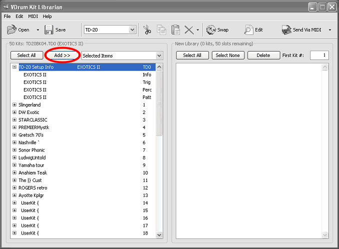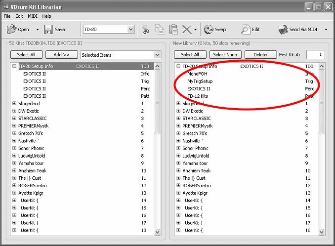 VDrumLib manages the copying of setup info in much the same way that it manages drum kit info. When you open a .TD0 or .TD9 file, the first item in the list will not be a drum kit. Instead, it will be labeled Setup Info, and it will have the TD0 file extension listed in the kit number column. To copy this info, just select it by clicking on it with your mouse, then click the Add button -- just like copying a drum kit. |
