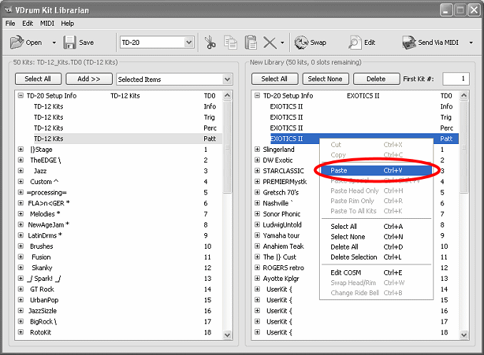 Now, that you have combined the setup info from your personal backup, it is safe to load the file into your module. The first 12-8 characters of the file name will be embedded into the *.td0/*.td9 so that it will appear on your TD LCD screen when you load it from the flash drive. So, if you use a descriptive name when you save the file from VDrumLib, then the TD LCD name will be the same as the filename that you see on your PC. When you are ready to copy the backup file to your flash drive for transfer to your module, you need to remember to rename the copy on your Flash drive to conform to Roland's file naming format -- don't worry, this will not change the TD LCD display name. |